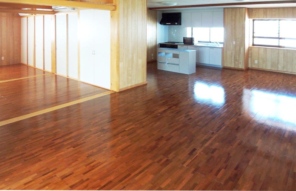 室内内装はプリント合板仕上げのおとなしめですが、キッチンやお風呂場はしっかりファミリーサイズ。間取りも6帖程度の洋室が2室とリビングが21帖とゆったりサイズです。