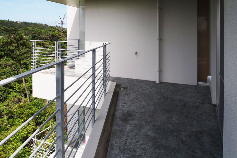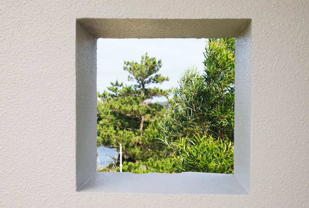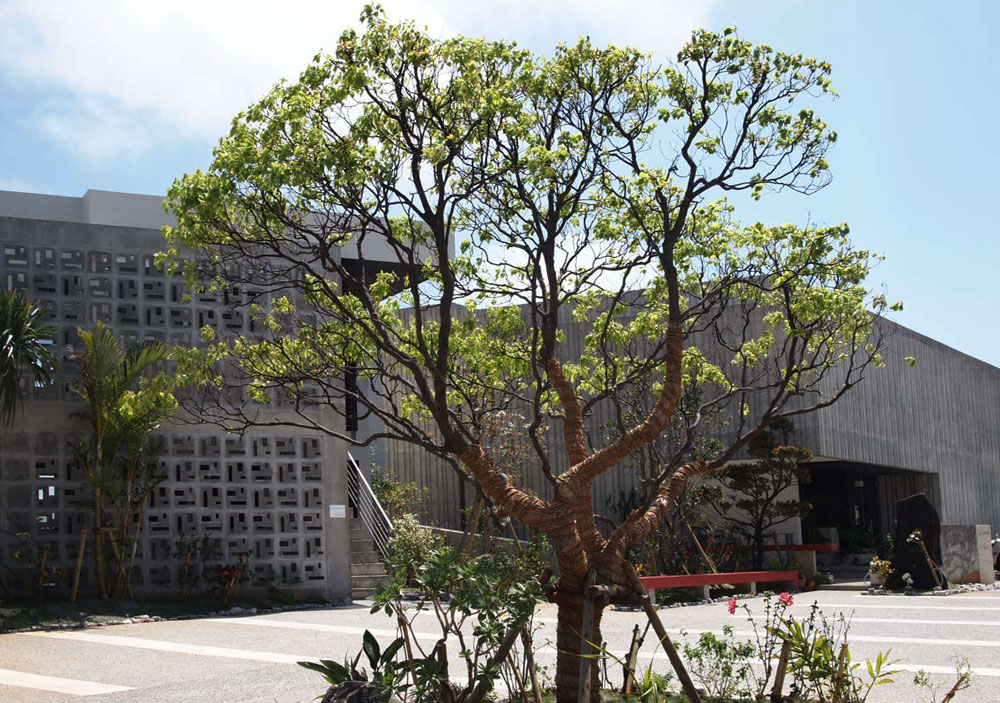 読谷村から恩納村に広がる東シナ海を望める丘陵地に建つどっしりと重量感がある打ち放ちの建物。